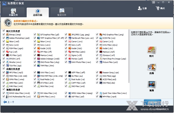 恢复照片,包括JPG,TIFF / TIF,PNG,BMP,GIF,PSD,CRW,CR2,NEF,ORF,RAF,SR2,MRW,DCR,WMF,DNG,ERF,RAW等。