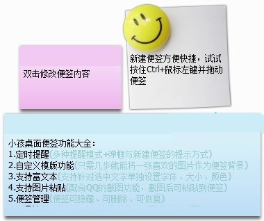 小孩桌面便签软件是一款简单易懂的桌面提醒软件。用户可以把当天要安排的事情记录下来都进行记录,软件界面简洁,功能十分丰富。软件还有许多精美的皮肤模板等你体验根本没广告而且还十分的小巧根本不占有你电脑上的体体积。用户还可自定义添加多个办公事项,多样的背景颜色,打造属于你的个性标签,还可设置闹钟提醒,防止你错过任何事项,非常的便利。让你不再忘记重要事项,完全就是为用户方便而打造的标签提醒软件。