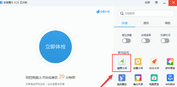 1、首先打开软媒魔方,然后在其界面右侧的“应用大全”中打开“清理大师”,如下图所示: