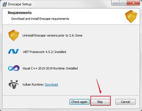 2、首先双击运行"1.Enscape-2.8.0-preview.1+20869.msi"程序,出现下图对话框,点击skip跳过;