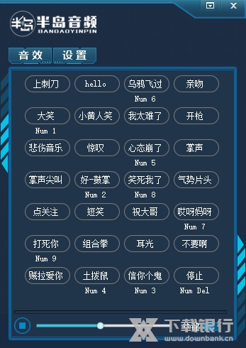 半岛音频音效助手是一款音效工具,该软件已经添加多种音效,只需在界面点击就可以实现播放,非常适合调节气氛来使用,有很多主播也会用到这种音效,当场面尴尬就会出现乌鸦的叫声非常的应景,软件操作也非常简单,选择需要使用的音效,单击即可进行播放,可根据实际需要灵活选择相应的音效,还可随时调节音效播放时的音量大小,你还可以设置快捷键来达到快速播放音效等效果。