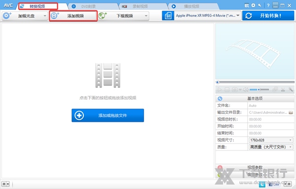 1、我们点击菜单栏上的的“转换视频”按钮,然后在下方的选项卡中点击“添加视频”,您还可以直接拖动视频到界面上。