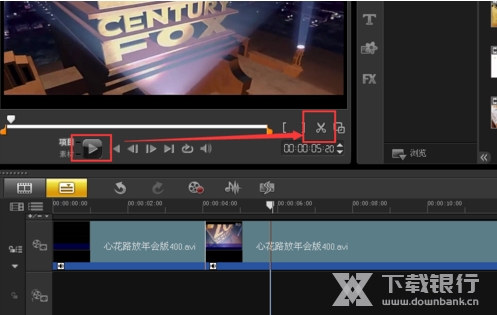 4、这时候视频会分割成两段,继续点击播放,到需要剪辑的位置的时候再次点击暂停播放,再点击【方框中的剪刀图标】。