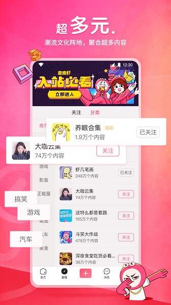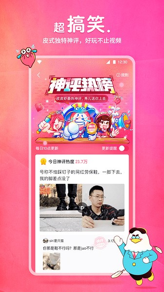 皮皮虾app的独特之处在于,它不仅仅是一个社交娱乐APP,更是一个集笑料、创意和互动于一体的社区。通过活动功能的强势入驻,皮皮虾创造了一个让用户留连忘返的空间。玩段子不再单调,用户可以随心选择喜欢的内容,感受到暖暖的贴心。在这里,不同兴趣标签用“#”号生成,让用户更便捷地寻找自己感兴趣的内容。皮皮虾独具创新性的功能,如实时搞笑视频、新鲜刷不停的实时搞笑内容,以及轻松配音等,为用户提供了丰富多样的娱乐体验。用户评论中提到,皮皮虾的神评和爆笑评论让他们笑出腹肌。而且,皮皮虾还能用视频来制作表情包,为用户创造更多创意的可能性。总体来看,皮皮虾是一款充满创意和趣味的社交娱乐APP,为用户带来了笑声和乐趣。