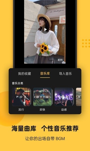 智能配乐、智能专场功能,分别可以自动进行匹配何时的音乐、匹配不同节奏点的剪辑、转场;