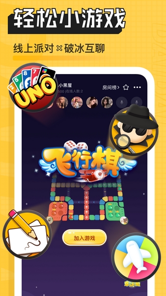 无聊、孤单?统统丢掉!全新的个性化娱乐交友社区,为你找到兴趣相同的灵魂伴侣,进入语音房一起玩互动小游戏,「恋爱飞行棋」「你画我猜」「谁是卧底」「桌球」「狼人杀」,听故事、讲笑话,让你与TA快速破冰,告别孤单,你想要样子TA都有,享受属于你的第二次人生